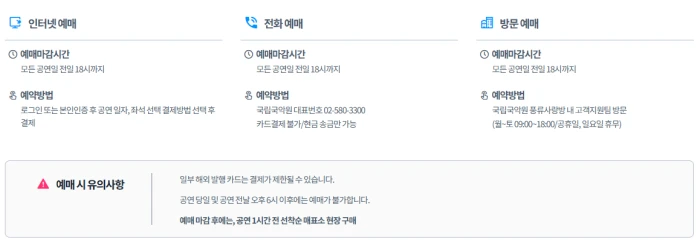 모든 예매(인터넷, 전화, 방문)는 공연일 전일 18시에 마감이 됩니다. 하지만 표가 남았을 경우 공연 1시간 전 선착순 매표소 현장 구매가 가능하니 참고하시기 바랍니다. 무료 공연의 경우 예매 신청자가 몰릴 수 있으므로 미리 예매하는 편이 좋아 보입니다.
