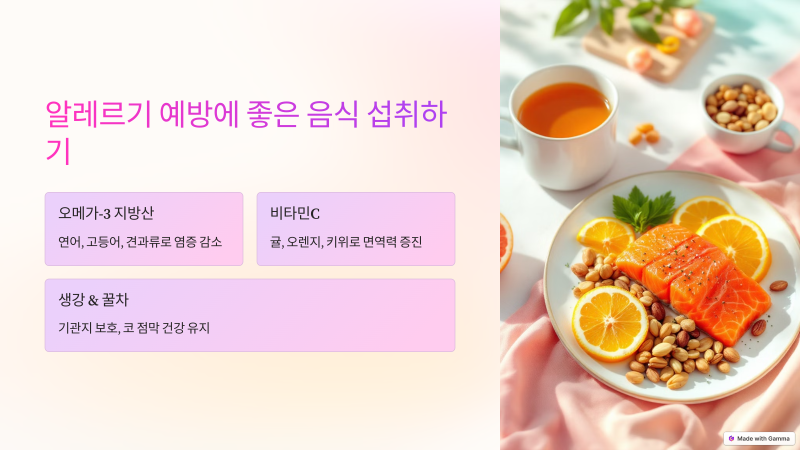 오메가-3 지방산: 연어, 고등어, 견과류 등에 풍부하여 염증을 줄여줘요. ✔ 비타민C: 귤, 오렌지, 키위, 브로콜리 등이 면역력을 높여줍니다. ✔ 생강 & 꿀차: 기관지 보호 효과가 있어 목과 코 점막을 건강하게 유지하는 데 좋아요.