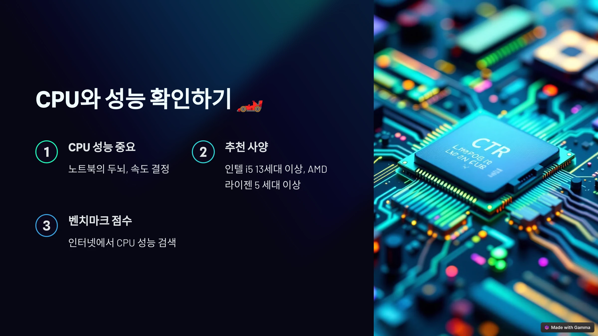 가장 중요한 건 노트북의 두뇌, 즉 CPU 성능이에요! 중고 노트북이더라도 너무 오래된 CPU를 선택하면 속도가 느려서 스트레스 받을 수 있어요. 😵💫