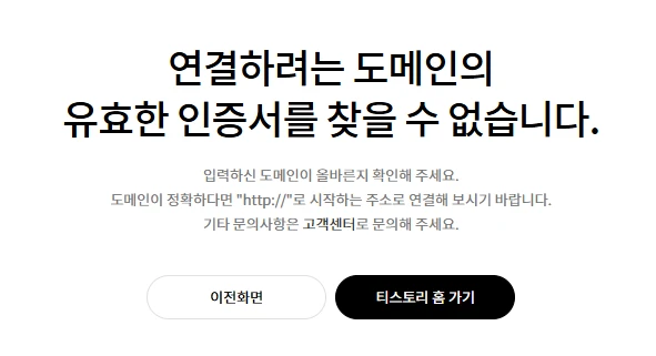 티스토리 개인 도메인 연결 시, 주소에 www가 들어가면 안 된다는 내용을 인터넷 검색 도중 확인하고, www를 제거한 뒤 다시 시도했다. 이번에도 도메인 연결 및 https 획득은 정상적으로 되었다고 뜨는데, 막상 해당 주소로 접속하면 접속이 되지 않는다. 주소 접속 시 아래와 같은 메시지 화면이 표출된다. "연결하려는 도메인의 유효한 인증서를 찾을 수 없습니다."