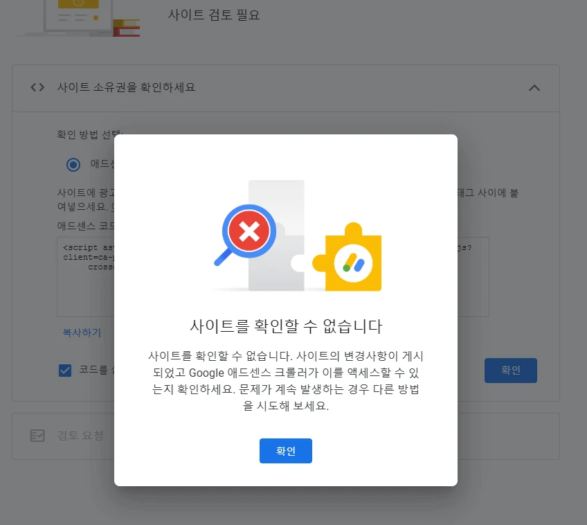 처음에는 아래의 사이트 연결 실패 메시지가 도메인 연결 후 얼마 되지 않아 발생되는 것으로 생각했는데, 하루가 지나고 구글 서치콘솔에 정상적으로 등록이 되어 있음에도 애드센스만 연결되지 않는 것이 이상했다. 따라서 뭔가 잘못됐다고 생각하고 다른 방법을 찾기로 했다.