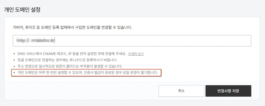 다시 완전히 삭제한 뒤 다시 시도해보려고 했으나, 개인 도메인 연결이 하루에 한 번만 되는 것을 몰랐다... 삭제 후 연결하려고 하니 아래와 같은 오류 메시지가 발생된다. 이럴거면 삭제할 때 경고 메시지에 포함해줘야 하는 것 아닌가 싶다. (이 때 화가 많이 남) 그런데 지금 다시 살펴보니 연결 설정 아래에 안내 문구가 적혀 있다....